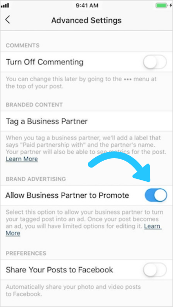 Under the Branded Content Partner Permissions section toggle on the Allow Business Partner to Promote button to give the brand/business access to promote your Branded Content post.