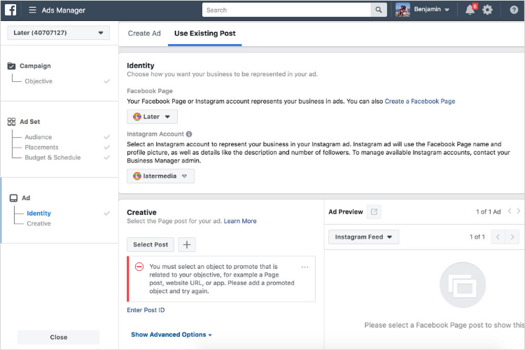 Once they do this, the business will be able to see the post in Ads Manager under Existing Posts and can choose to run it as a feed ad.
