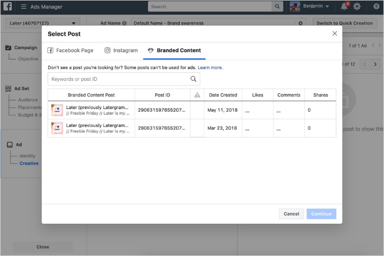 In the Select Post window navigate to the Branded Content tab. You’ll see the list of the branded content posts that a creator has given you permission to promote. Choose the branded content post that you want to promote on Instagram.