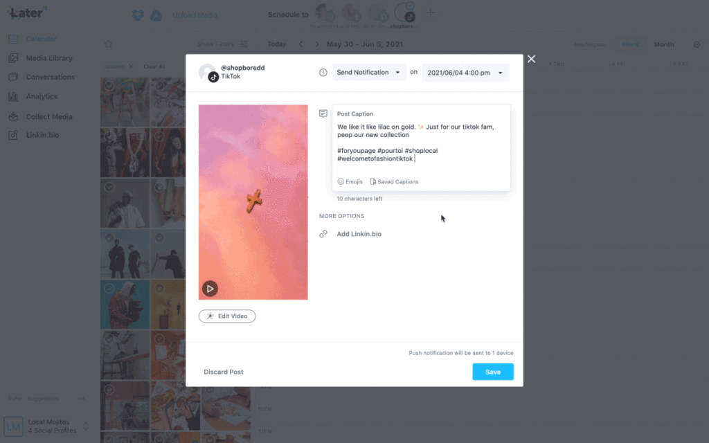 With Later’s Linkin.bio for TikTok, you can turn your feed into a clickable, mobile-optimized landing page – letting you attach a specific link to each of your scheduled videos.