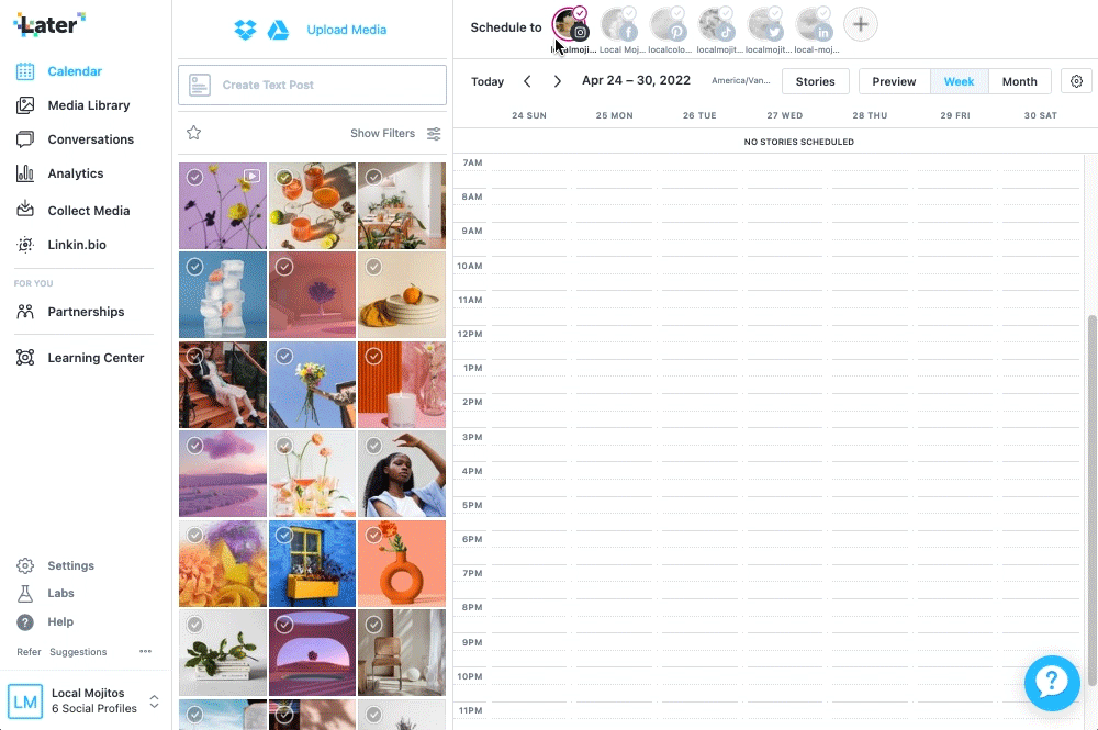 Drag photos and videos from your desktop, Dropbox, or Google Drive and drop them directly into your Later Media Library.