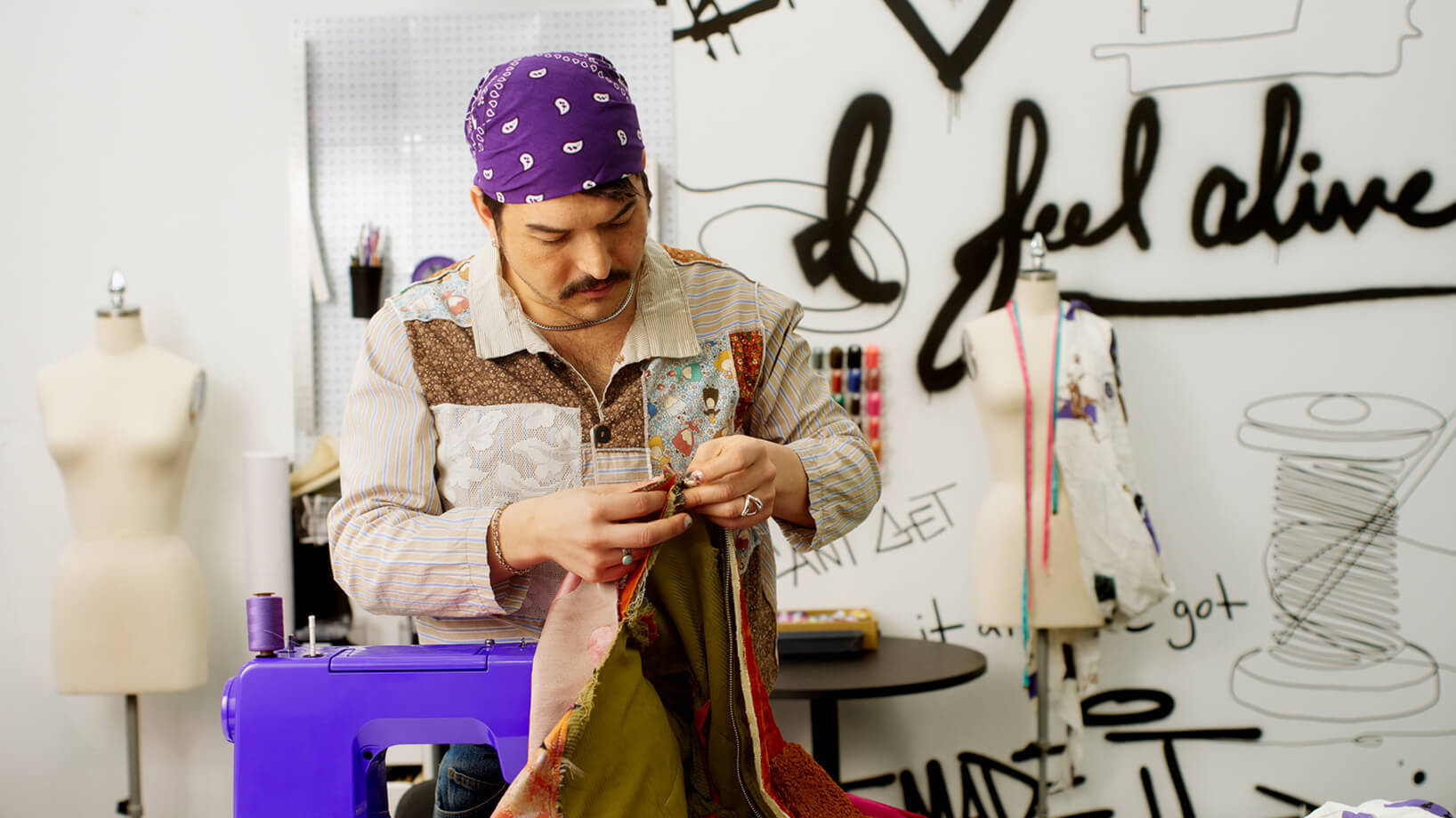 Julian is a designer and maker whose work transforms reclaimed textiles into one-of-a-kind wearable art. In his studio—surrounded by tools, materials, and music—he experiments freely, embracing vulnerability and creative risk.