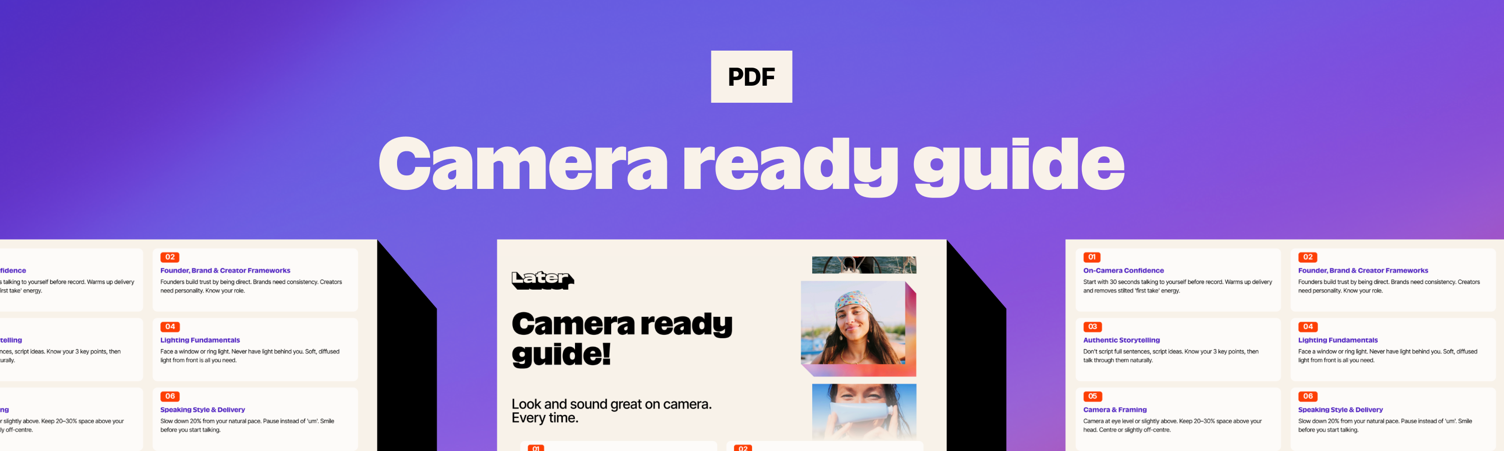 Later's Camera-Ready Guide is a free PDF download covering 10 core fundamentals for creating confident, professional-looking video content, no expensive equipment required.
