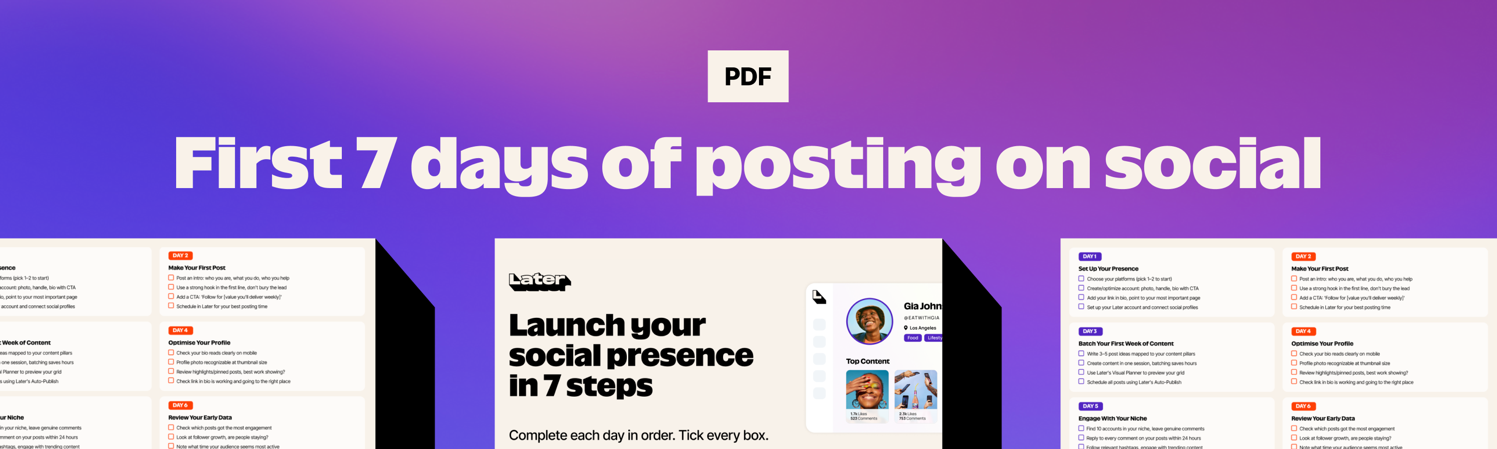 Later's First 7 Days on Social Checklist is a free PDF download that gives you a clear, day-by-day action plan for launching your social media presence from scratch.