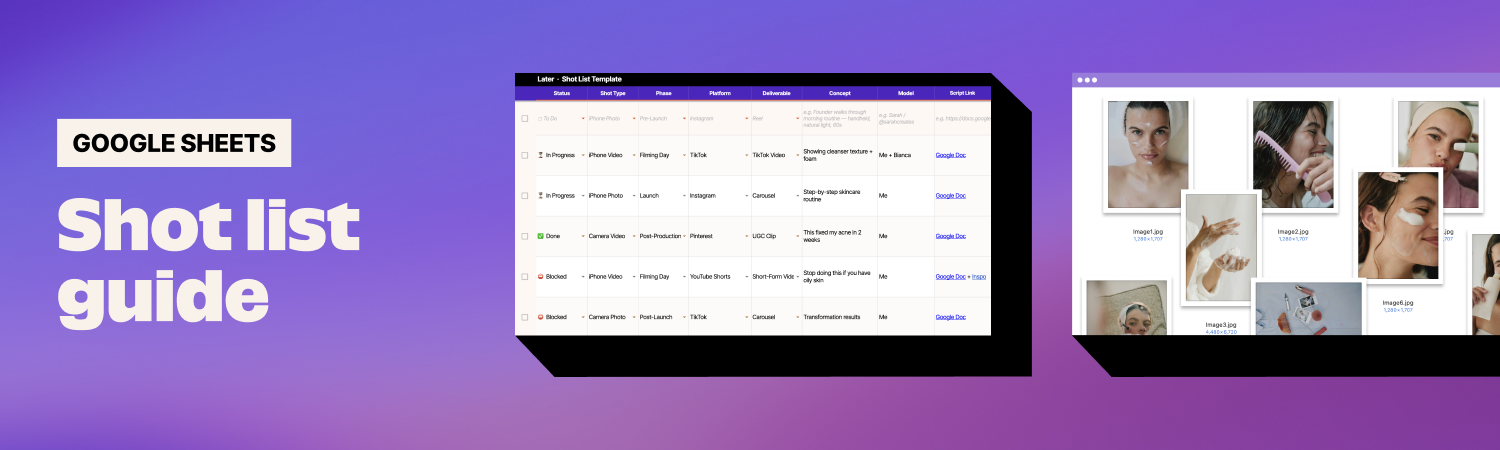 Later's Shot List Template is a free Google Sheets download that gives content creators, social media managers, and marketing teams a single place to plan, brief, and track every shot before and during a filming day.