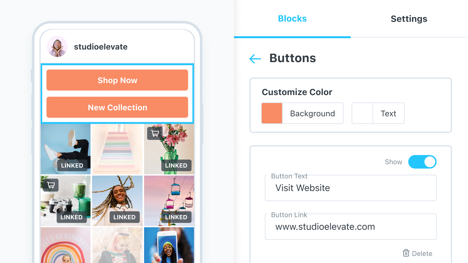The easiest way to send traffic (and mega sales) from your social profiles to your website? A customized Link in Bio page. Later’s Link in Bio tool includes various content blocks and turns your images into clickable, shoppable content. Cha-ching.